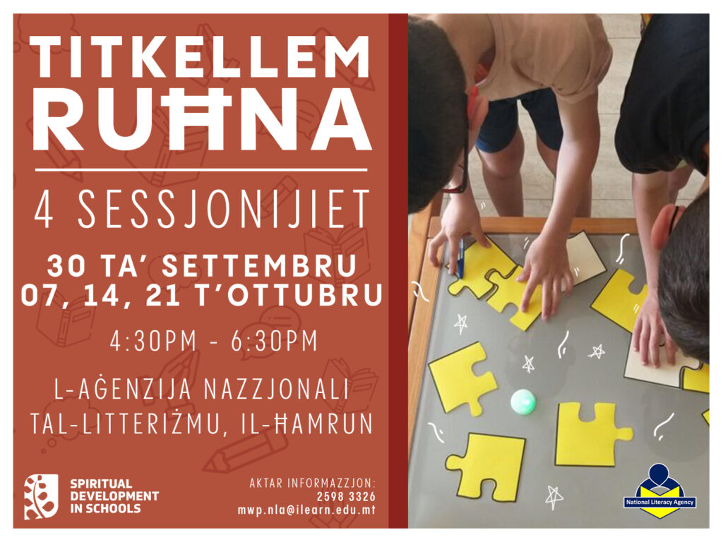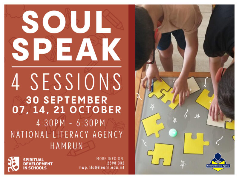 L-Aġenzija Nazzjonali tal-Litteriżmu, bil-kollaborazzjoni ta’ Spiritual Development in Schools ser torganizza erba’ sessjonijiet ta’ programm ta’ kitba, qari u riflessioni jismu ‘Titkellem Ruħna’ (Soul Speak) għal tfal mir-4 sena sas-6 sena tal-iskola primarja (minn 8 sa 10 snin).