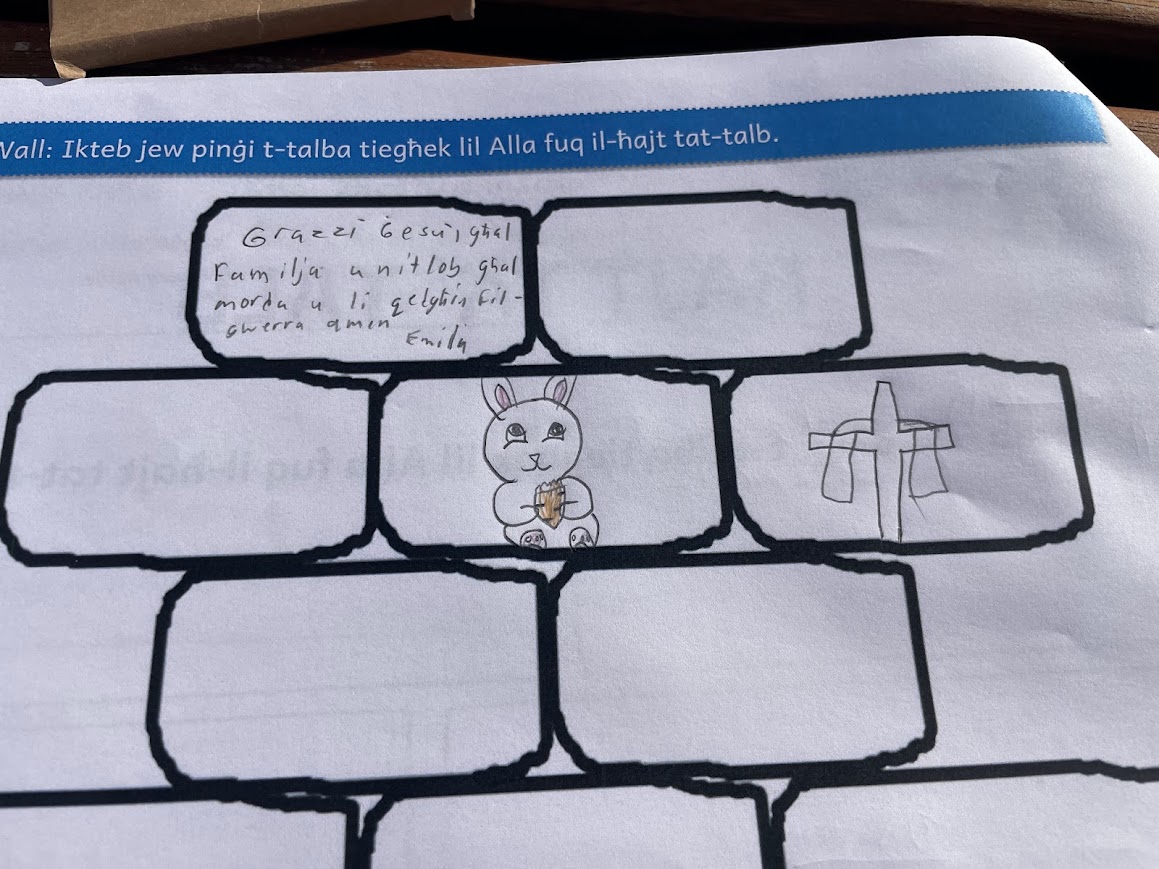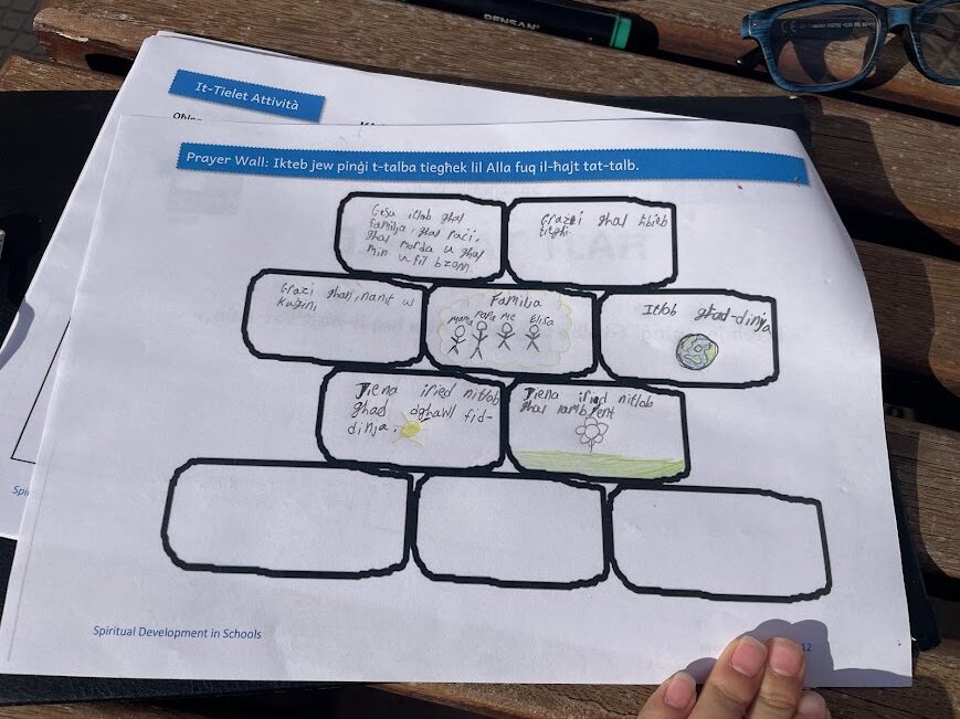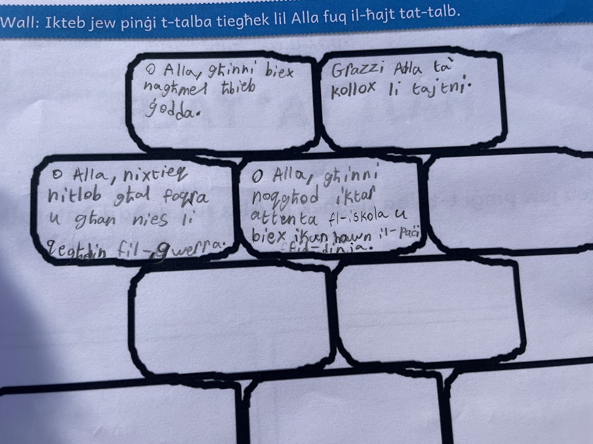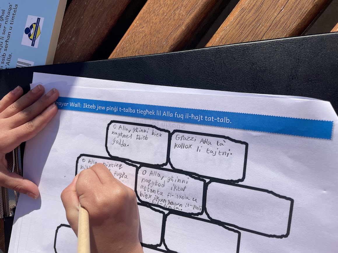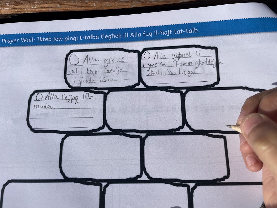 After the storytelling, the children moved into a prayer space experience inspired by the story itself. Just as the characters in the story used the wall, the children were invited to write on a wooden wall prepared for them. This moment became very meaningful as they wrote their thoughts, feelings, and prayers quietly and respectfully.