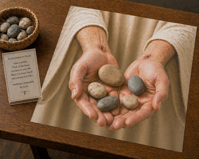 Remember that nothing is impossible for God. If you choose to entrust everything in His hands: pray the Our Father, pausing at “your will be done…” as you place the stone where indicated.